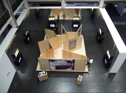 leads the observer through a sequence of rooms furnished with medical stage props: beginning in the waiting room, we pass through the consulting room, an operating theatre and recovery room as far as the place of leave-taking. Alongside photographs, each of the rooms receives one of the six external video fireplaces, which show pictures of monks, sacrificial ceremonies of a brickworks and a hospice in India. Schlingensief staged himself in them as a distanced traveller – which he, however, did not remain for long: only a short time after his return, he was diagnosed with a life-threatening illness. In a sense of foreboding, the previously created progression already ended in a Beuys Room (or also: a diagnostic room), which relates to the latter’s installation zeige deine Wunde [Show your Wound] from the 1970s: this also took illness and transience as its topic and is